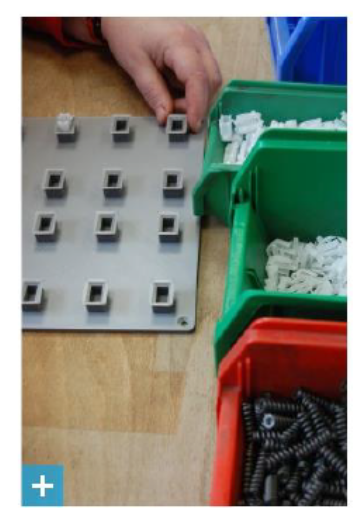 Zunächst wurde in der Werkstatt Grabe eine Montagehilfe für den Zusammenbau der dreiteiligen BG-Federsysteme entwickelt und von der Uni Paderborn gedruckt. Dabei handelt es sich um eine Platte mit vorgegebenen Einlassungen. Hier werden die drei Komponenten ineinandergesteckt. Die Platte kann mit dem Arbeitstisch verschraubt werden, sodass ein Wegrutschen unterbunden wird. Zwei Mitarbeiter berichten von den Erfahrungen beim Einsatz der 3D-Helfer:„Die Federmontageplatte war zu Beginn ungewohnt für die Beschäftigten. Nachkurzer Eingewöhnungszeit wird hiermit gerne gearbeitet.“